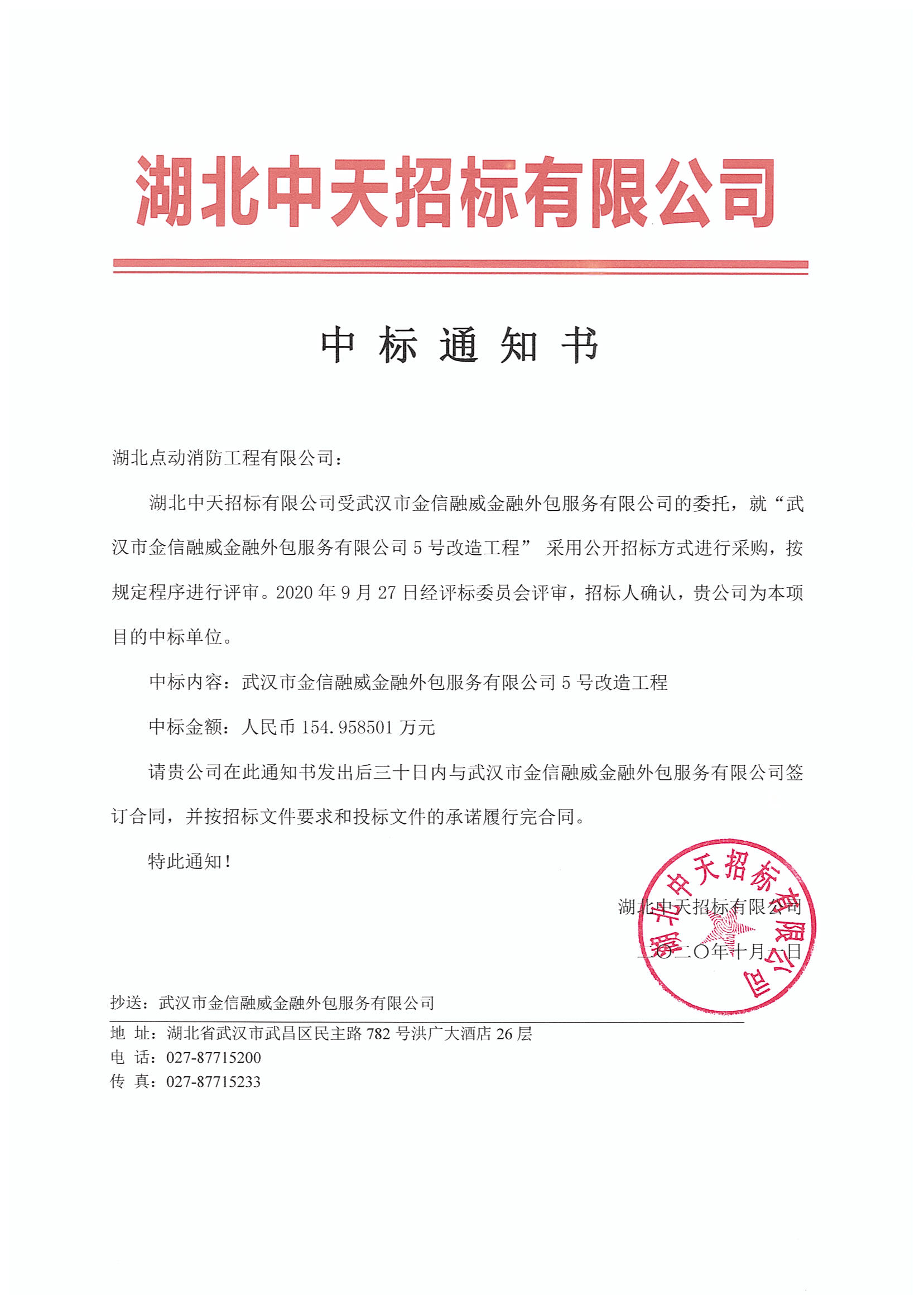 近日,在武汉市武昌区民主路782号宏光大酒店26层实施的“武汉市金信融威金融外包服务公司5号改造工程)””项目中,我们一举中标。